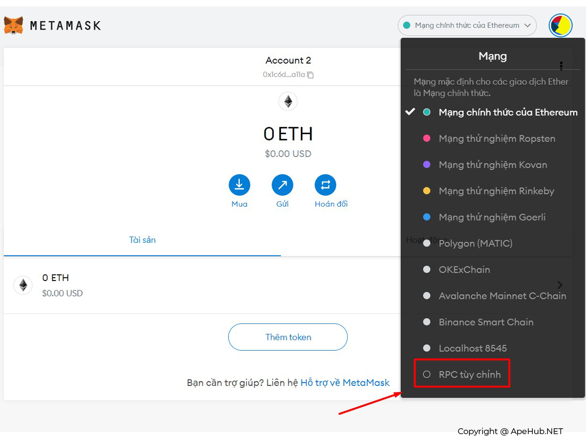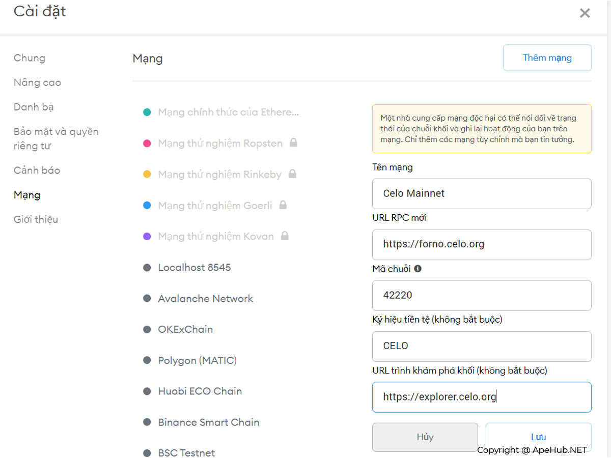 Hướng dẫn tích hợp mạng Celo (CELO) vào ví Metamask. ApeHub sẽ hướng dẫn các bạn cách cài, add thêm mạng CELO trên ví Metamask đơn giản, chính xác, ai cũng làm được.