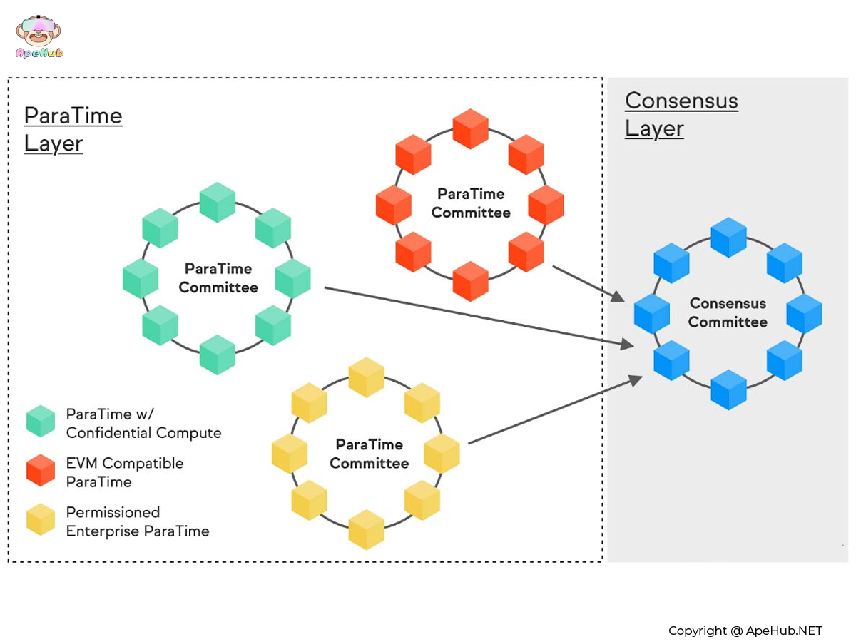 Ngoài ra, Oasis còn sử dụng ParaTime Architecture tách biệt đồng thuận (Consensus Layer) từ tính toán (ParaTime Layer) cho phép khả năng mở rộng cao hơn và hỗ trợ các nhu cầu tính toán chuyên biệt đa dạng.